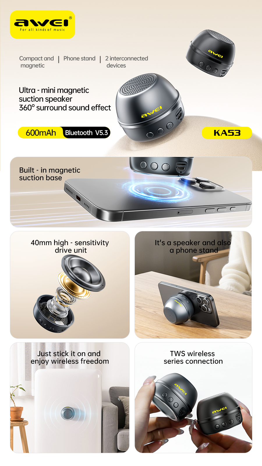 Awei KA53 Magnetic Mini Suctions Bluetooth Speaker